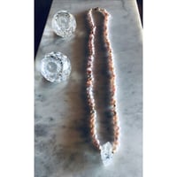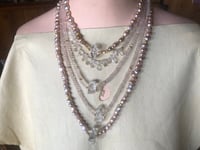22” of pink + pearl freshwater pearls, with an XL Herkimer diamond. 18k goldfill findings.