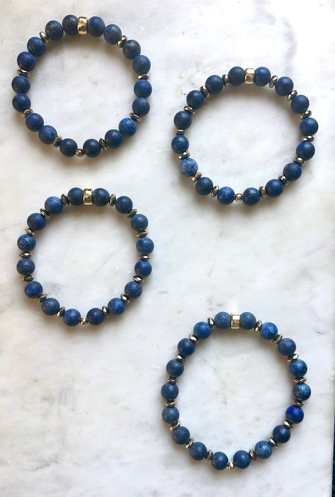 Gorgeous raw, unpolished lapis beaded bracelets. 22k goldfill and pyrite accents.