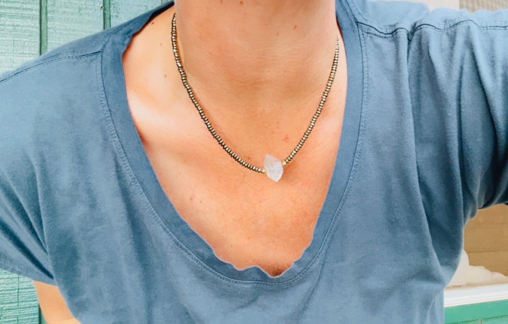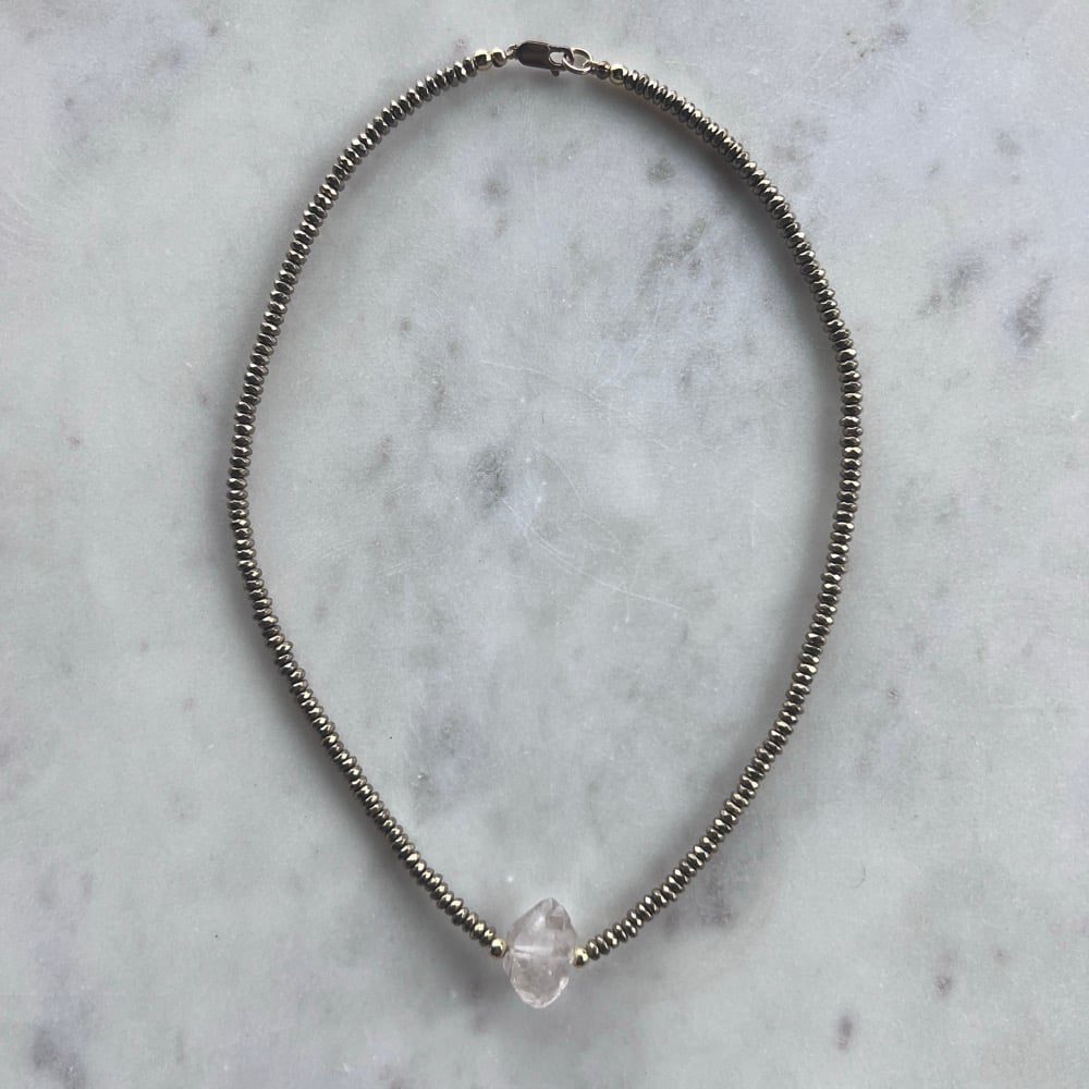 Small pyrite faceted beads are a sparkly addition to your neck party and a single XL Herkimer diamond quartz.