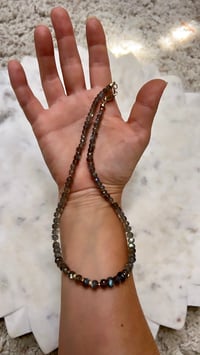 Skinny labradorite + gold beads with a single Lemurian quartz point. From pale green to beautiful blues, these stones are stunning and feel really light on the neck.