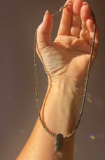 18.5" of mini, faceted rounded pyrite beads with a black tourmaline teardrop. Goldfill findings.