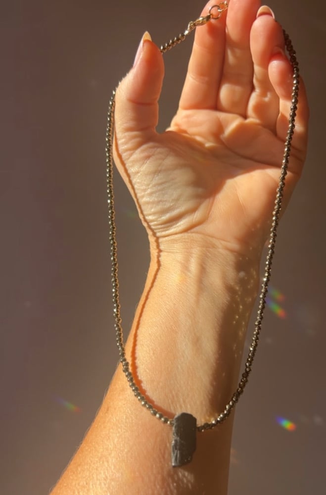 Handmade on Maui, Pyrite/black tourmaline from Brazil. You may receive this exact crystal or another similar in shape and size.
