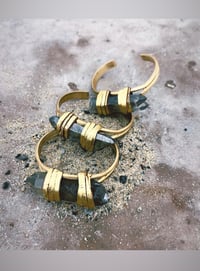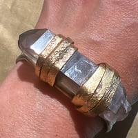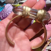 Stunning, champagne hued TWIN SMOKEY Quartz on solid brass bracelet 2.5” with gold metallic leather wrap. Twins are excellent for dedicating to a partnership or relationship of any kind. Smokey quartz are incredibly grounding and they repel negative energy, only second to black tourmaline.
