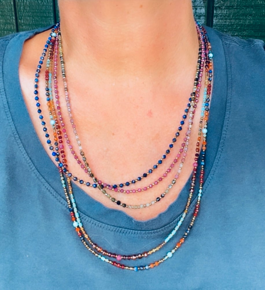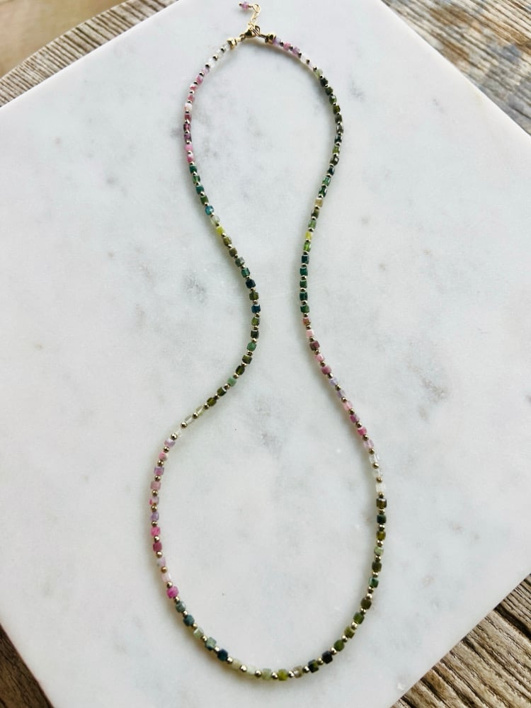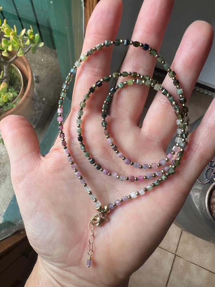 Pink and Green! WATERMELON TOURMALINE wrap bracelets that double as a necklace! These have 18k goldfill clasps, mini pyrite beads, and are 22" with a 1" extender chain - Victoria has a petite wrist and can comfortably wrap this 3x around the wrist. Shown on neck also.