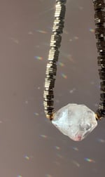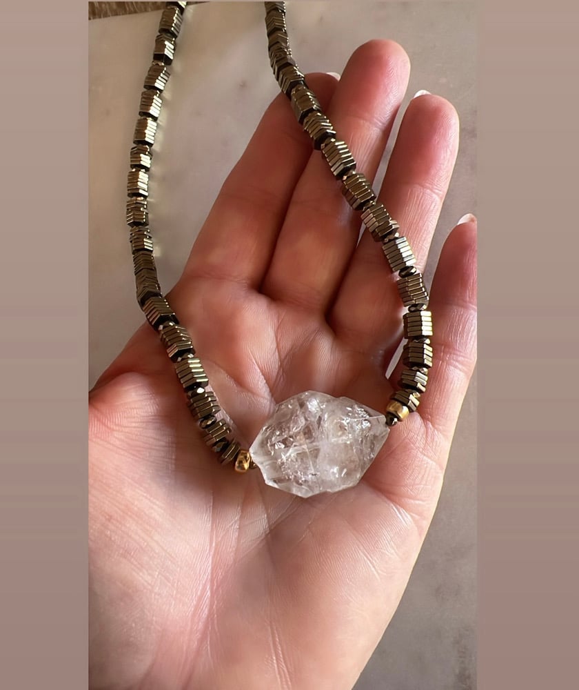 Pyrite is great for attracting money and also offers protection vibes. 22k gold findings. The crystal has rainbows in it and is top shelf quality. The naturally double-terminated shape adds to the balancing power of this crystal.