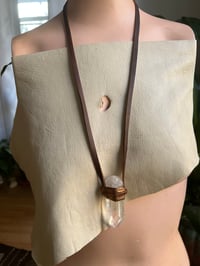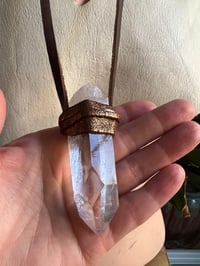 XXL Diamond Window Lemurian crystal, wrapped in bronze + brown leather cord. Thick leather cord is 30" in length-plus 3" crystal drop. This is a huge crystal that isn't messing around!